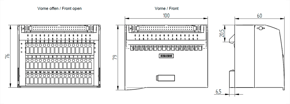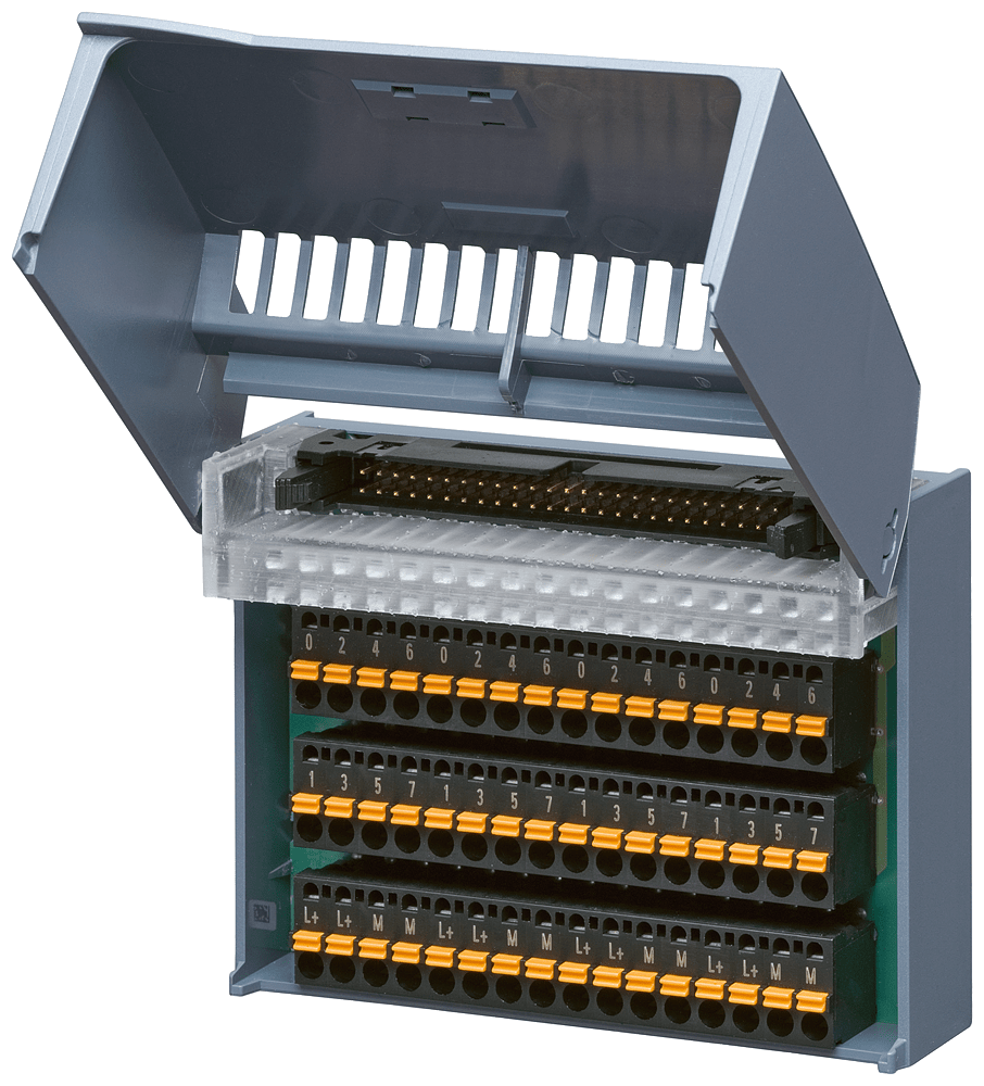 modulo di connessione TP1 32 canali e 4x2 morsetti per alimentazione del potenziale tipo: morsetto a vite con LED, VPE=1 pezzo collegamento IDC a 50 poli per cavo Il modulo di connessione TP1 per un collegamento a 1 conduttore con 32 canali e collegamento di potenziale con morsetti a vite e LED per la segnalazione, costituisce linterfaccia tra i cavi di collegamento della periferia provenienti dal campo e il SIMATIC S7. Questo viene montato sulla guida DIN ed è, grazie alla sua funzionalità con morsetti a vite, perfettamente adatto al rispettivo compito. Questo modulo di connessione è parte integrante del collegamento completamente modulare di SIMATIC TOP connect per il cablaggio di sistema più rapido e più sicuro. Oltre ad un ridotto onere di cablaggio è possibile una riduzione significativa delle fonti di errori. I sensori e gli attuatori della periferia vengono addotti ai moduli di connessione di SIMATIC TOP connect e da questi, tramite cavo di collegamento e modulo connettore frontale, collegati con il SIMATIC S7-300/1500.