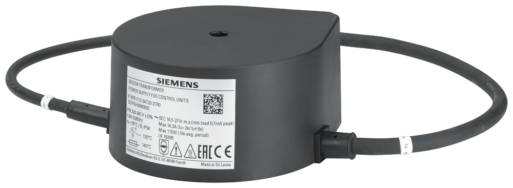 SIDOOR TRANSFORMER alimentatore da rete, tensione di ingresso AC 220-240 V(+/-10%)50/60 Hz, tensione di uscita 16,5-18V valore efficace, percorso completo raddrizzato, IP54, incl. cavo di rete con connettore Shuko (CEE 7/7) lungo 2 m, incl. cavo di collegamento a dispositivo di comando lungo 1,5 m Lalimentatore da rete SIDOOR TRANSFORMER è lunità di alimentazione standard per i dispositivi di comando SIDOOR. Con una moderata performance è possibile muovere masse dinamiche fino a 400 kg. Il TRANSFORMER è disponibile come esecuzione UE e come variante UL con UL 61010-1, CSA C22.2 No. 61010-1-12. Per le prestazioni massime è disponibile lalimentatore da rete switching 6FB1112-0AT20-3PS0 SIDOOR NT40.