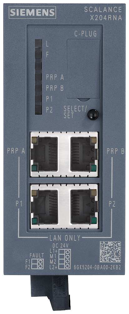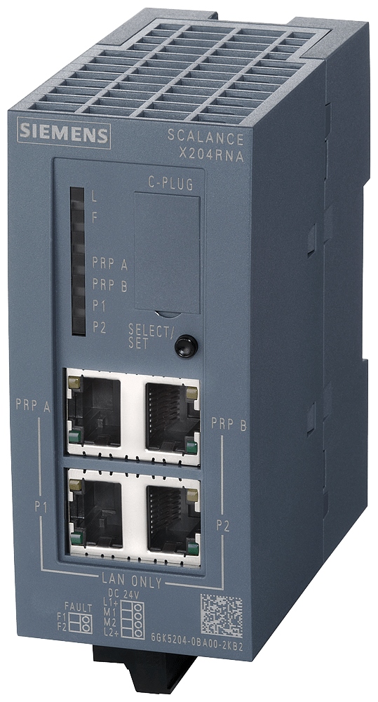SCALANCE X204RNA; Redundant Network Access; 4x 100 Mbit/s porte RJ45; diagnostica LED; contatto di segnalazione errore con tasto SET; ridondanza della alimentazione di tensione; Network Management; incl. manuale elettr. su CD-ROM, C-PLUG opzionale per reti PRP . SCALANCE X204RNA managed, switch compatto di Layer 2, 4x RJ45 da 100 Mbit/s per il collegamento di apparecchiature non PRP a reti PRP. Indicato per numerose applicazioni: Lo SCALANCE X204RNA offre unampia varietà di switch Ethernet altamente performanti in diverse varianti: dagli switch Gigabit agli switch robusti per i requisiti dellautomazione discreta e di processo. I potenti switch Gigabit SCALANCE X204RNA sono stati sviluppati per rispondere ai difficili requisiti delle reti negli ambienti industriali. Grazie allhardware potente e alle funzioni avanzate, assicurano uninfrastruttura di rete affidabile e scalabile per qualsiasi applicazione. Realizzazione semplice e affidabile di molte applicazioni industriali.