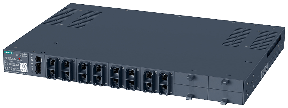 SCALANCE XR324-4M PoE; switch IE managed, rack da 19; 8x 10/100/1000 Mbit/s per porte RJ45 elettriche con PoE, 8x 10/100/1000 Mbit/s per porte RJ45 elettriche senza PoE; 4x 10/100/1000 Mbit/s media module a 2 porte, elettriche oppure ottiche; diagnosticaLED; contatto di segnalazione ; pulsante Select/Set, PROFINET IO Device, alimentazione di tensione DC 24 V; porte frontali SCALANCE XR324-4M PoE managed, rack switch di Layer 2, 8x RJ45 PoE da 10/100/1000 Mbit/s, 8x RJ45 da 10/100/1000 Mbit/s, 4x 10/100/1000 Mbit/s per Media-Modules, DC 24 V, porte sul lato anteriore per lalimentazione di apparecchiature con funzionalità PoE. Switch per quadro elettrico SCALANCE XR324-4M flessibile e compatto: la prossima generazione di reti industriali combina OT e IT per una produzione più flessibile e sicura. I nostri switch Ethernet SCALANCE XR-300 come apparecchi compatti o come switch a19 per il quadro elettrico assicurano un elevato livello di funzionalità e flessibilità con Industrial Edge e, in futuro, anche conTime-Sensitive Networking (TSN). Scoprite i molteplici vantaggi della nostra serie di apparecchiature SCALANCE XR-300: dagli switch per il quadro elettrico da utilizzare negli ambienti industriali agli switch Ethernet in design compatto, fino agli switchper le condizioni industriali più gravose: con SCALANCE XR324-4M si trova sempre il giusto switch per numerose applicazioni.