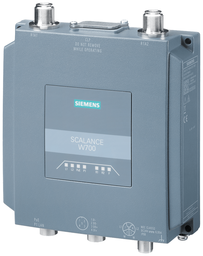 IWLAN Client, SCALANCE WUM766-1 1 interfaccia radio, 2,4/5 GHz, 2 collegamenti N-Connect, supporto iFeature via CLP, IEEE 802.11ax (Wi-Fi 6), 1201 Mbit/s (lordo) per ogni interfaccia radio, 1x porta M12 10/100/1000 Mbit/s, DC 24 V ridondante, L-coded M12PoE, IP65, -30 ... +60 °C, slot per CLP, DI/DO, A-coded, osservare le omologazioni nazionali! ID-Cert: MSAX65-W1-M12-E2, FCC ID: LYHMSAX65V1 funzionamento al di fuori di USA/Israele dotazione di fornitura: cappucci per collegamenti SCALANCE WUM766-1, 1x interfaccia radio, 2 collegamenti N-Connect, supporto iFeatures tramite CLP, IEEE 802.11ax (Wi-Fi 6), 2,4/5 GHz, data rate lordo 1201 Mbit/s, 4x porte M12 da 10/100/1000 Mbit/s, DC 24 V ridondante, IP65, slot per CLP, M12 L-coded, PoE, per il funzionamento fuori da USA/Israele. Per la gestione del collegamento radio con funzioni sviluppate appositamente per lindustria (PCF/PCF-MC) di unapparecchiatura collegata con connessione Industrial Ethernet. 1 pezzo. Le apparecchiature sono adatte sia per limpiego nel quadro elettrico sia senza quadro elettrico in ambiente interno. Mediante funzioni sviluppate appositamente per lindustria è possibile una comunicazione wireless sicura tramite PROFINET con PROFIsafe fino a 150 Mbit/s. Integrazione di impianti industriali in infrastrutture WLAN, sostituzione economicamente vantaggiosa di linee cavi, forma costruttiva leggera e compatta per limpiego efficiente su sistemi di trasporto automatici (AGV). Dimensioni compatte e salvaspazio per il montaggio nel quadro elettrico. Particolarmente a prova di futuro grazie alla conformità con lo standard WLAN IEEE 802.11 riconosciuto a livello mondiale. Traffico dati prevedibile (funzionamento deterministico) e tempi di risposta definiti sul canale radio. Comunicazione PROFINET per requisiti di real-time e ridondanza, nonché trasmissione dei dati rilevanti per la sicurezza tramite PROFIsafe. Semplicità di gestione tramite Web Server e SNMP. Inoltre risparmio di costi utilizzando una unica rete radio. Della gamma completa di accessori fanno parte un ampio portfolio di antenne, connettori, attrezzo spelafili, accessori di montaggio e di tecnica di cablaggio che completano il sistema.