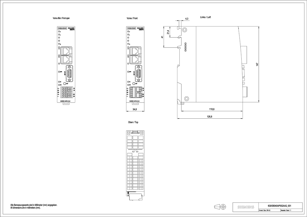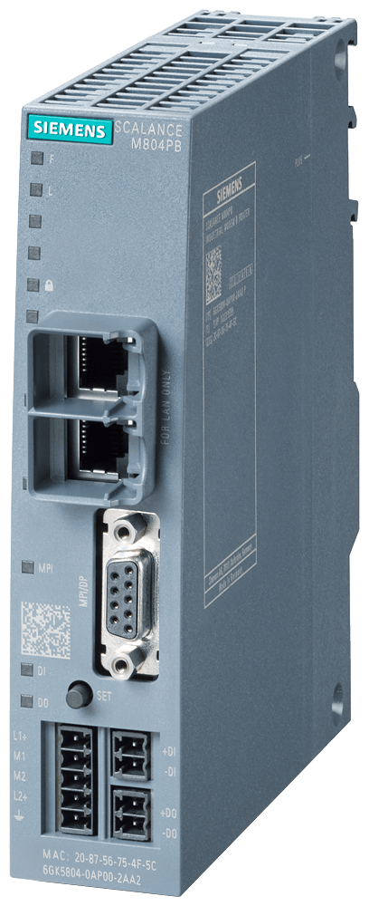 SCALANCE M804PB; router per il collegamento sicuro remoto di apparecchi di automazione PROFIBUS / MPI alle reti Ethernet tramite VPN e firewall. ulteriori funzioni: conversione di indirizzo (NAT/NAPT), collegamento a SINEMA RC, switch a 2 porte; 1x ingresso digitale, 1x uscita digitale. SCALANCEComponenti di reteM804PBVPN e Firewall, velocità di trasmissione 10 Mbit/s, 100 Mbit/s, 1x RJ45 e 1x Sub-D (rete interna), 1x RJ45 (rete esterna), morsettiera, 1x interfaccia RS 485, grado di protezione IP20.Per il collegamento economico e sicuro di impianti PROFIBUS/ MPI.Collegamento diretto, comodo ed economico, di sistemi esistenti con PROFIBUS / MPI, per laccesso remoto sicuro a macchine ed impianti remoti.Custodia robusta in plastica per il montaggio su guidaDIN o a parete. Accesso remoto sicuro protetto con firewall (stateful inspection) e collegamenti VPN (IPsec) come parte integrante del concetto di Industrial Security. Bassi costi di investimento e di esercizio per il monitoraggio e il comando di sottostazioni collegate in remoto. Riduzione dei costi di viaggio e del personale grazie alla programmazione e alla diagnostica in remoto tramite reti radiomobili. Panoramica ottimizzata per lintegrazione meccanica grazie ai formati unificati delle unità con SIMATIC S7-1500 / ET 200MPAccessori come supporti di memoria rimovibile C-Plug e Key-Plug, piedistallo per montaggio su tavolo nonché telai di montaggio, completano perfettamente il prodotto.