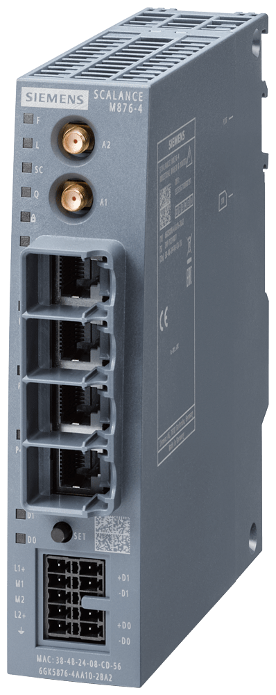 router 4G SCALANCE M876-4; per la comunicazione IP wireless di apparecchiature di automazione basate su Ethernet tramite LTE ottimizzato per reti radiomobili (4G) per lutilizzo a livello mondiale, VPN, firewall, NAT; switch a 4 porte; 2x antenne SMA, tecnologia MIMO; 1x ingresso digit., 1x uscita digit.; osservare le omologazioni nazionali! SCALANCE M876-4 router 4G; per la comunicazione IP wireless di controllori programmabili basati su Ethernet mediante la trasmissione radiomobile LTE (4G) ottimizzata per lutilizzo in tutto il mondo, VPN, firewall, NAT; switch a 4 porte; 2x antenna SMA, MIMO Technology; 1x ingresso digitale, 1x uscita digitale; osservare le omologazioni nazionali!