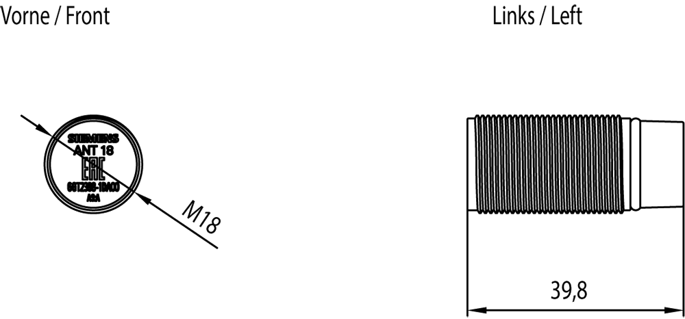 SIMATIC RF300 /RF200 antenna ANT 18 in acciaio inossidabile, -25...+70°C, IP65, filetto M18x1, lunghezza 40 mm; senza cavo di collegamento. SIMATIC RFAntennaAntenna ANT 18 in acciaio inox, senza cavoAntenna ANT 18 in acciaio inox, RF300/RF200, M18x1-40 mm, IP65, senza cavo
