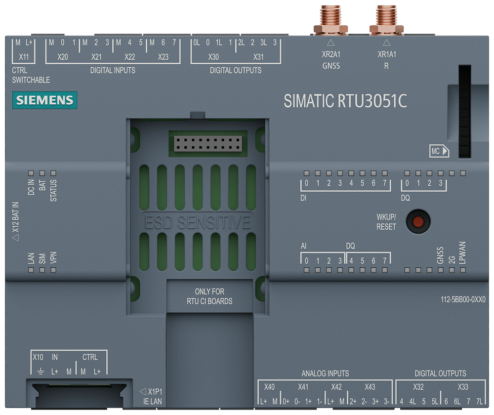 SIMATIC RTU3051C compatta Low-Power RTU; funzionante a batteria oppure con energia fotovoltaica; collegamento alimentazione di tensione est. DC 10,8V... 28,8V; modem integrato per LTE-M/NB-IoTv2; GNSS; collegamento a TeleControl Server Basic; protocolli caricabili: DNP3, IEC 60870-5-104, SINAUT ST7 oppure MQTT; I/O onboard: 8 DI, 8 DO, 4AI; client FTP; porta Ethernet, configurazione / diagnostica tramite Web server, sincronizzazione dellora, SMS, e-mail, slot schede SD. osservare le omologazioni nazionali! RTU Low Power compatta SIMATIC RTU3051C; alimentata da batteria o da pannello solare; collegamento dellalimentazione di tensione esterna da DC 10,8 V a 28,8 V; modem integrato per LTE-M/NB-IoTv2; GNSS; collegamento a TeleControl Server Basic; protocolli caricabili: DNP3, IEC 60870-5-104, SINAUT ST7 o MQTT; I/O onboard: 8 DI, 8 DO, 4 AI; FTP Client; porta Ethernet, configurazione / diagnostica tramite Web Server, sincronizzazione dellora, SMS, e-mail, slot per SD. Osservare le omologazioni nazionali!