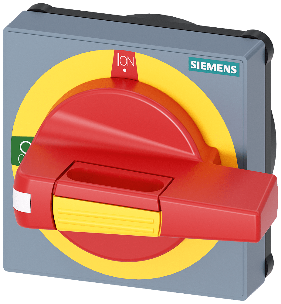 operatore con mostrina frontale ARRESTO DI EMERGENZA dimensioni 75x 75, per albero 8x 8, 0-I, operatore grandezza 55mm, 3LD5 UL Comandi manuali per un comodo utilizzo dellinterruttore automatico scatolato 3VA. Disponibilità come comando rotativo frontale, per porta e parete laterale con diverse possibilità di chiusura a chiave e con interblocco Le manopole sono disponibili nelle varianti standard e ARRESTO DI EMERGENZA, ciascuna con o senza kit di illuminazione. Interruttori automatici scatolati SENTRON 3VA - Un sistema. Per tutte le applicazioni.