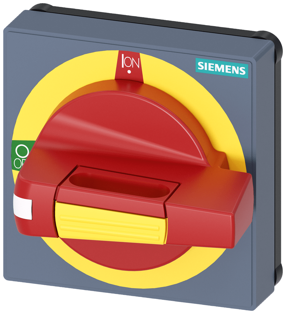 manopola con mostrina frontale emergenza dimensioni 75 x 75, per albero 8x 8, Test-0-I, operatore grandezza 45mm accessori per 3KD grand. costr. 1 e 2, 3KF grand. costr. 1 Comandi manuali per un comodo utilizzo dellinterruttore automatico scatolato 3VA. Disponibilità come comando rotativo frontale, per porta e parete laterale con diverse possibilità di chiusura a chiave e con interblocco Le manopole sono disponibili nelle varianti standard e ARRESTO DI EMERGENZA, ciascuna con o senza kit di illuminazione. Interruttori automatici scatolati SENTRON 3VA - Un sistema. Per tutte le applicazioni.