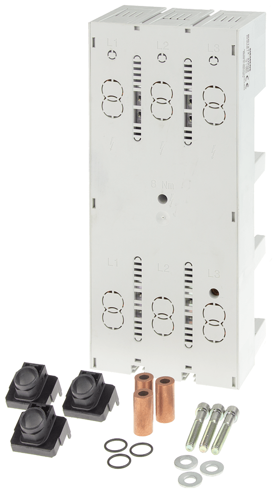 adattatore apparecchio MCCB, a 3 poli, 250 A interasse sbarre collettrici 60mm per 3VA12/20/21/22/52/61/62 241 x 105mm gli elementi di contatto con ladattatore sono compresi nella fornitura Adattatore apparecchio SENTRON 8US1 per sistemi di sbarre collettrici per il montaggio di dispositivi di protezione. I sistemi di sbarre collettrici 8US Siemens offrono molteplici possibilità per linstallazione di apparecchi di collegamento, manovra e installazione adattabili a sbarre. La struttura modulare, così comeil fissaggio meccanico e la contattazione elettrica in una sola operazione sono vantaggiosi. Grazie alla copertura di protezione a prova di dito degli adattatori e dei portapparecchi è garantita unelevata sicurezza di funzionamento. Sono dotati di una omologazione internazionale e consentono possibilità di impiego in tutto il mondo nel settore della costruzione di macchine e impianti. Il sistema di sbarre collettrici 8US1 è disponibile con interassi delle sbarre collettrici diversi. Sistemi di sbarre collettrici SENTRON - sicuri, poco ingombranti, organizzati in modo chiaro.