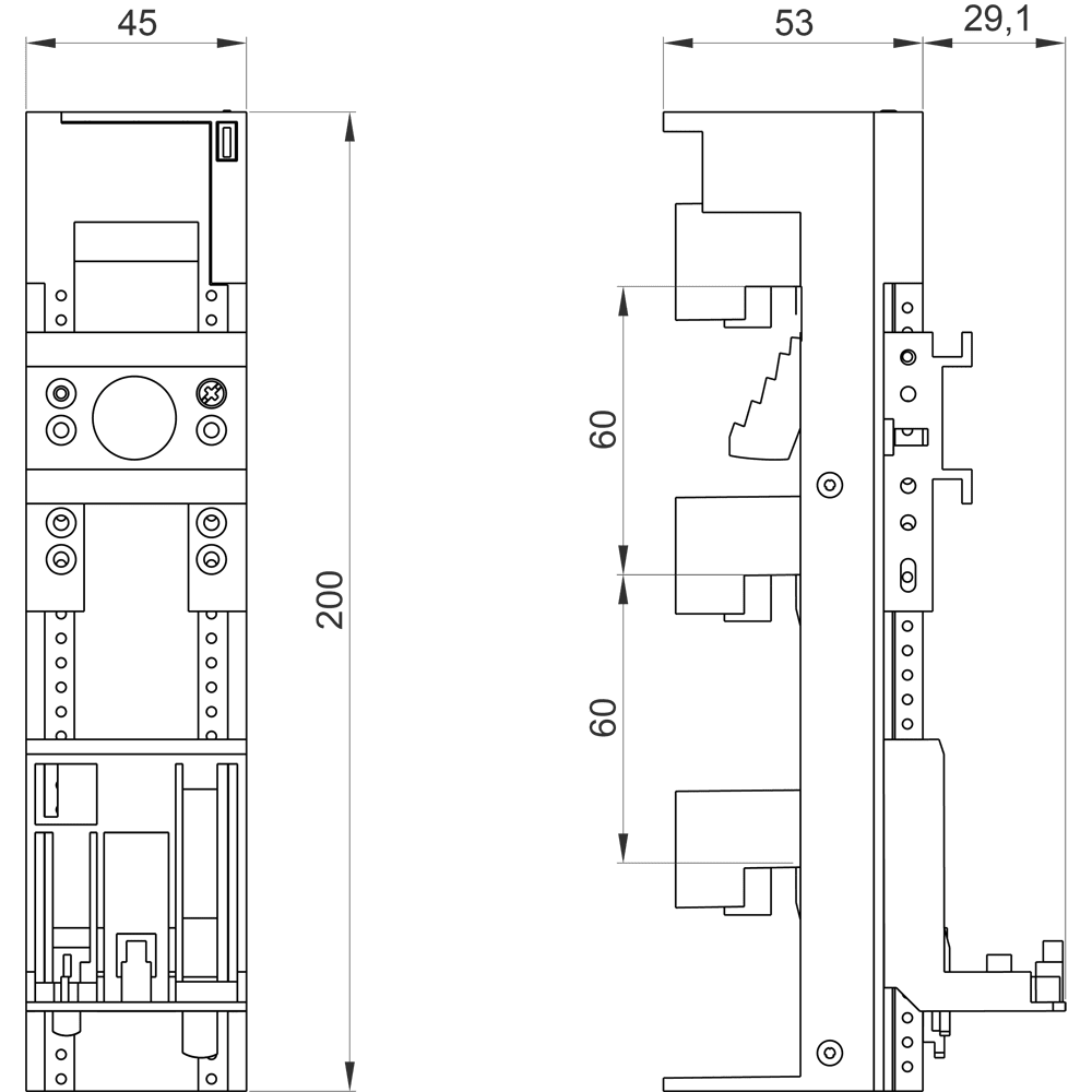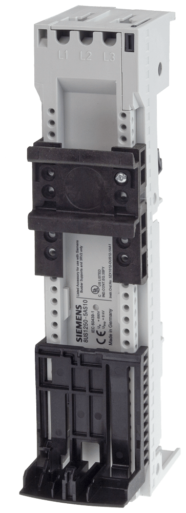 portapparecchi, lunghezza 45x 200mm per sistema di sbarre collettrici 60mm, distanziatore in dotazione 2 elementi di collegamento in dotazione profilato di supporto avvitato portapparecchi SENTRON 8US1 per sistemi di sbarre collettrici per il montaggio di dispositivi di protezione. I sistemi di sbarre collettrici 8US Siemens offrono molteplici possibilità per linstallazione di apparecchi di collegamento, manovra e installazione adattabili a sbarre. La struttura modulare, così come il fissaggio meccanico e la contattazione elettrica in una sola operazione sono vantaggiosi. Grazie alla copertura di protezione a prova di dito degli adattatori e dei portapparecchi è garantita unelevata sicurezza di funzionamento. Sono dotati di una omologazione internazionale e consentono possibilità di impiego in tutto il mondo nel settore della costruzione di macchine e impianti. Il sistema di sbarre collettrici 8US1 è disponibile con interassi delle sbarre collettrici diversi. Sistemi di sbarre collettrici SENTRON - sicuri, poco ingombranti, organizzati in modo chiaro.
