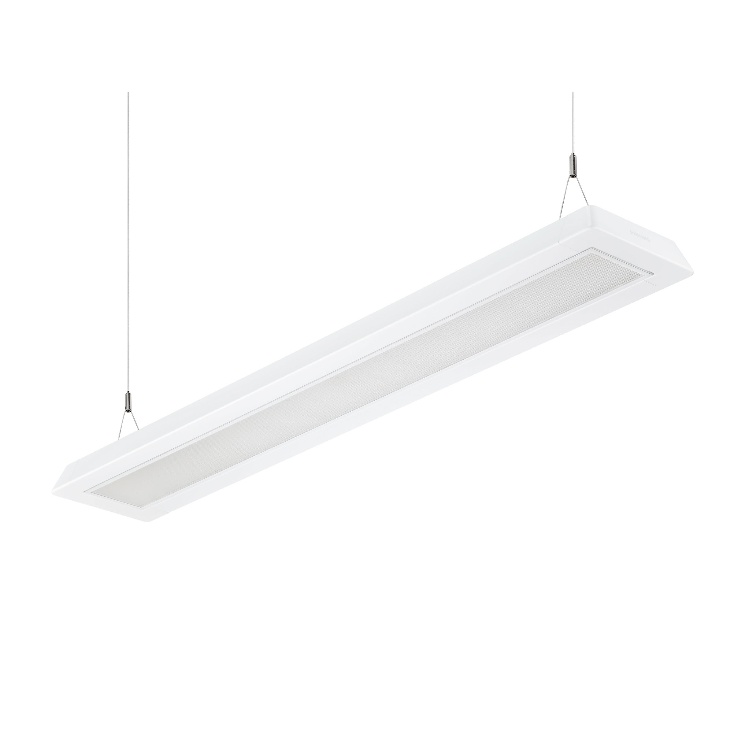1200x200 mm; H73 mm, Acciaio, Bianco, Bianco segnale (RAL9003), Set sospensione doppio, triangolo, Unità di alimentazione con interfaccia DALI, 4800 lm, 36 W, 133 lm/W, 4000 K, (0.43, 0.40) SDCM 3, CRI90, UGR19, Fascio largo, Testurizzata, Policarbonato,IP20 | Protetto contro l'accesso con un dito, IK02 | 0,2 J standard, Classe di isolamento I, Connettore a pressione 5 poli