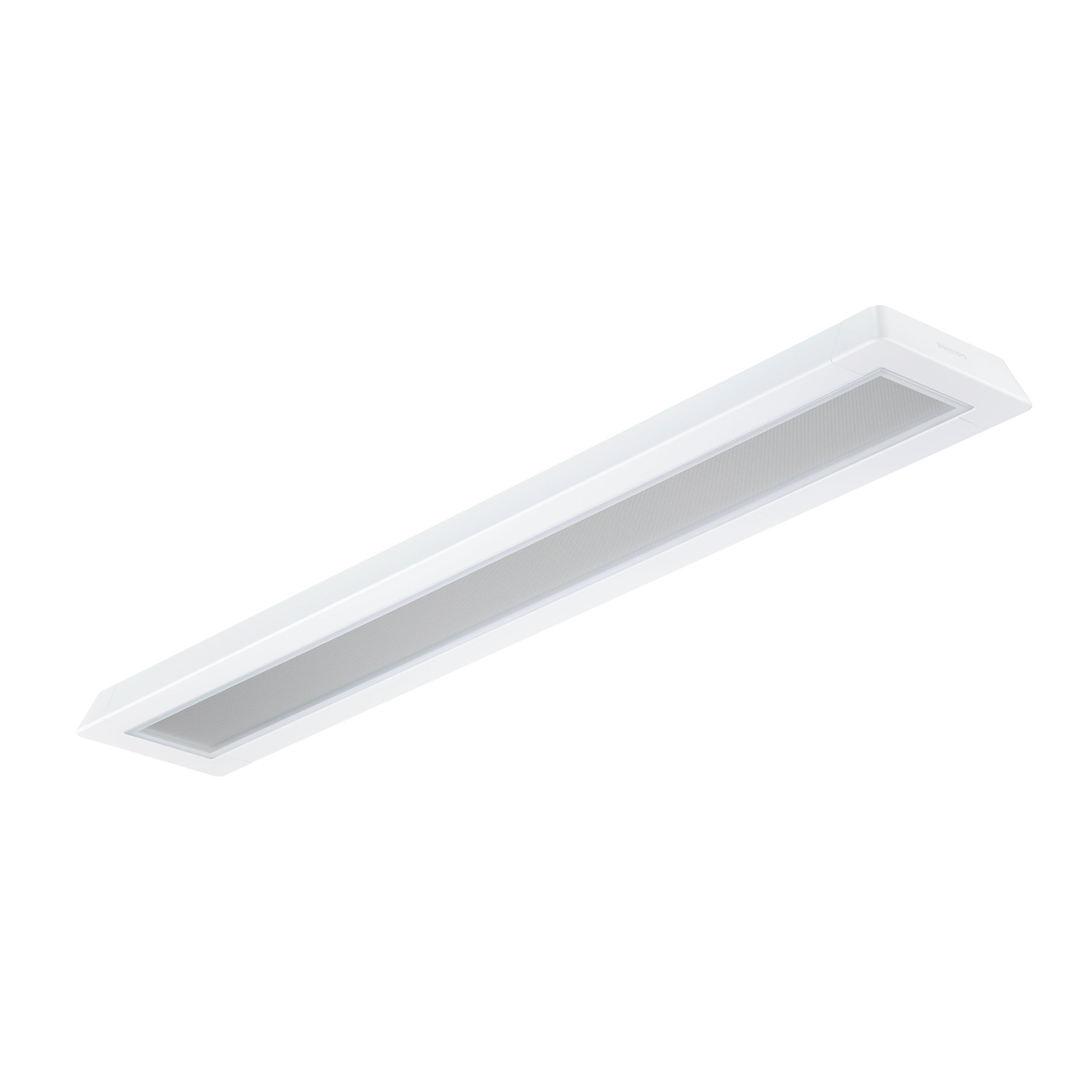 1200x200 mm; H73 mm, Acciaio, Bianco, Bianco segnale (RAL9003), Unità di alimentazione con interfaccia DALI, 4000 lm, 39 W, 103 lm/W, 4000 K, (0.43, 0.40) SDCM 3, CRI90, UGR19, Fascio largo, Testurizzata, Lente in policarbonato metacrilato, IP20 | Protetto contro l'accesso con un dito, IK02 | 0,2 J standard, Classe di isolamento I, Connettore a pressione 5 poli