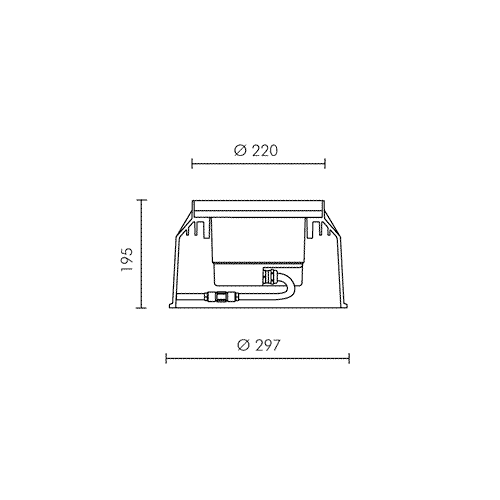 Cassaforma per FLAT Ø220mm. Fornito con cassaforma in polipropilene predisposta per l'entrata dei cavi che permette di: 1) eseguire un facile cablaggio; 2) alloggiare il connettore rapido; 3) eseguire facilmente la rimozione dell'apparecchio per la manutenzione. Foro da incasso: 297x195mm.