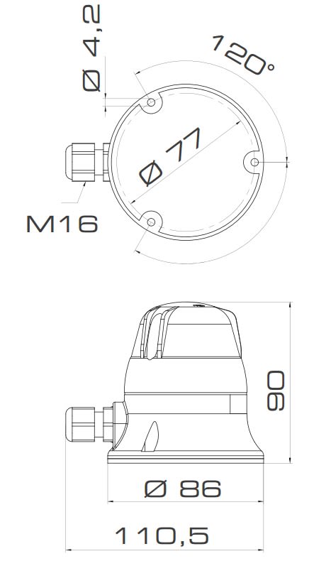 Dispositivo luminoso per applicazioni industriali a bordo macchina, versione a luce fissa/lampeggiante con lampada a filamento. Base in PC/ABS, cupola in policarbonato. Fissaggio tramite viteria standard non fornita. Lampada a incandescenza con attacco Ba15d 5W. Suono continuo (con luce fissa) o suono intermittente F/m 130 (con luce lampeggiante). Frequenza: 2700Hz