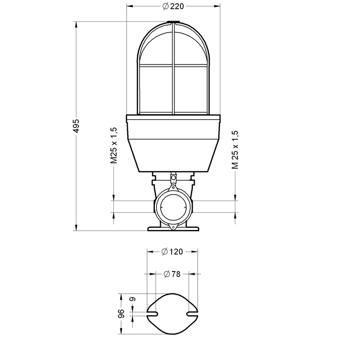 Luce fissa EX 080 LA F o lampeggiante EX 080 LA L antideflagrante di grandi dimensioni, con lampada a filamento. Disponibile anche con lampada alogena H1 EX 080 LA L H. Questa luce antideflagrante del Gruppo II può essere installata in aree con atmosferaesplosiva zona 1, 2, 21 e 22.