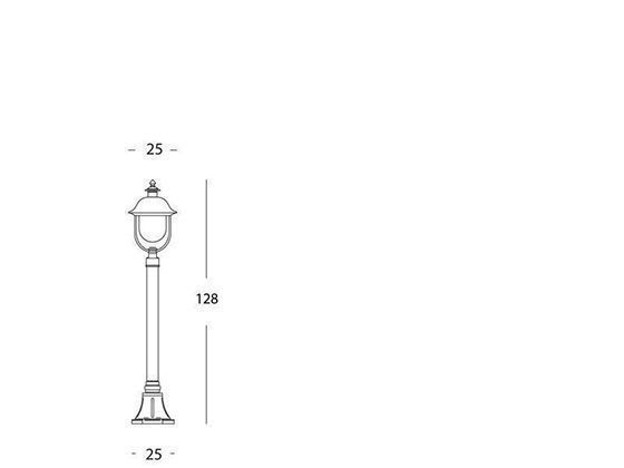 Palo con struttura in pressofusione di alluminio. Copertura superiore in rame. Diffusore in termoplastico trasparente. Triangolo di fissaggio a terra. Altezza max lampada: 150mm. Alimentazione 230 V ~ 50 Hz. Classe di protezione: IP43 Potenza massima lampade: 100W