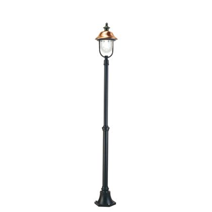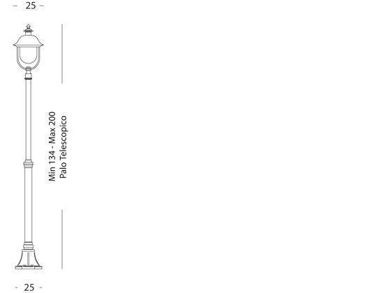 Palo con struttura in pressofusione di alluminio. Copertura superiore in rame. Diffusore in termoplastico trasparente. Triangolo di fissaggio a terra. Altezza max lampada: 150mm. Alimentazione 230 V ~ 50 Hz. Classe di protezione: IP43 Potenza massima lampade: 100W