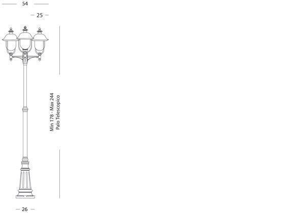 Palo con struttura in pressofusione di alluminio. Copertura superiore in rame. Diffusore in termoplastico trasparente. Triangolo di fissaggio a terra. Altezza max lampada: 150mm. Alimentazione 230 V ~ 50 Hz. Classe di protezione: IP43 Numero lampade: 3 Potenza massima lampade: 100W