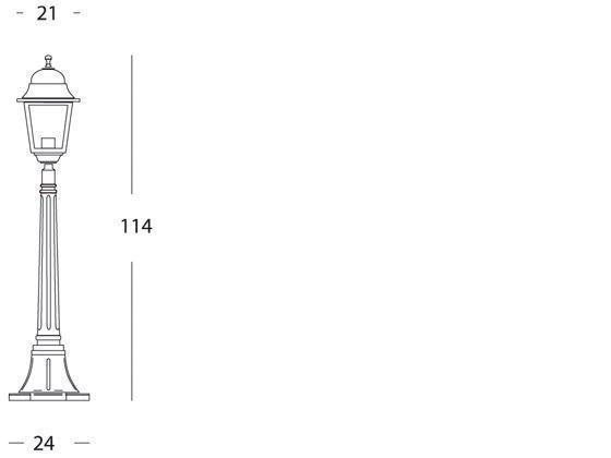 Palo in pressofusione di alluminio. Diffusori in vetro trasparente. Altezza max lampada: 210mm. Triangolo di fissaggio a terra. Alimentazione 230 V ~ 50 Hz. Classe di protezione: IP43 Potenza massima lampade: 100W