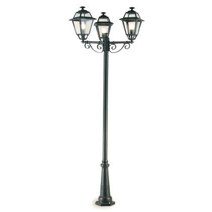 Struttura in pressofusione di alluminio. Diffusori in vetro trasparente. Dispositivo di connessione e accessori per il fissaggio. Portalampada in porcellana con attacco E27. Altezza lampada: max 210mm. Lampada esclusa. Alimentazione 230V ~ 50Hz. Classe di protezione: IP43 Numero lampade: 3 Potenza massima lampade: 100W