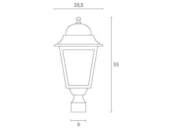 Struttura in pressofusione di alluminio. Diffusori in vetro trasparente. Testa palo con manicotto da 60mm di diametro. Dispositivo di connessione e accessori per il fissaggio. Portalampada in porcellana con attacco E27. Altezza lampada: max 240mm. Lampada esclusa. Alimentazione 230V ~ 50Hz. Classe di protezione: IP43 Potenza massima lampade: 100W