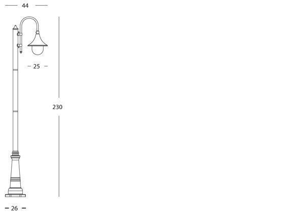 Struttura in pressofusione di alluminio. Diffusore in termoplastico trasparente. Dima per fissaggio a terra, dispositivo di connessione e accessori per il fissaggio. Portalampada in porcellana con attacco E27. Altezza lampada: max 150mm. Alimentazione 230V ~ 50Hz. Classe di protezione: IP43 Potenza massima lampade: 60W