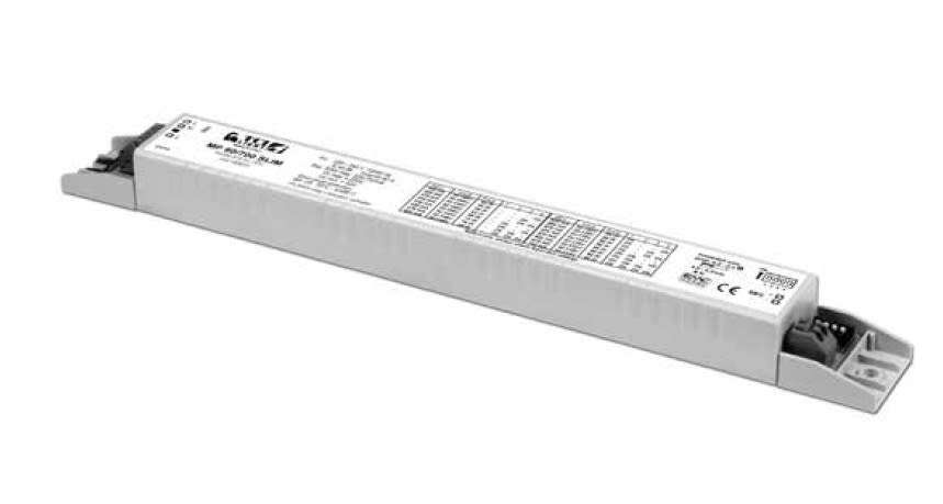 Alimentatore da incorporare. Alimentatore multipotenza fornito di dip-switch per la selezione della corrente in uscita. PFC attivo. Corrente regolata ±5 % incluse variazioni di temperatura. Uscita non isolata dall’ingresso. Utilizzabile per apparecchi di illuminazione in classe di protezione I e II. Morsetti di entrata e uscita contrapposti (sezione cavo fino a 1,5 mm2 / AWG15). Fissaggio dell’alimentatore tramite asole per viti. Protezioni: termica e cortocircuito; contro le extra-tensioni di rete; contro i sovraccarichi. Protezione termica = C.5.a.