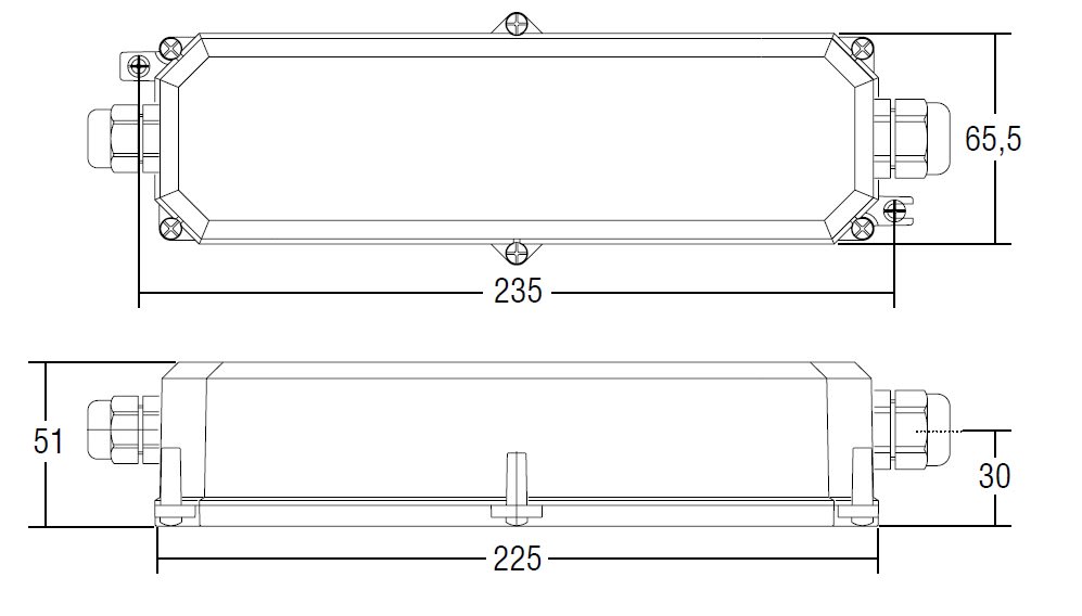 Alimentatore indipendente IP67, per uso esterno. Protetto in classe I contro le scosse elettriche per contatti diretti e indiretti. Fornito di cavi su primario e secondario per il collegamento. Se il cavo di rete è danneggiato deve essere sostituito da personale autorizzato. Fissaggio dell’alimentatore tramite asole per viti. Protezioni: termica e cortocircuito; contro le extra-tensioni di rete; contro i sovraccarichi. Tropicalizzazione disponibile su richiesta
