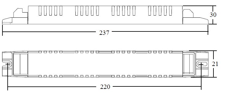 Alimentatore elettronico da incorporare. Utilizzabile per apparecchi di illuminazione in classe di protezione I e II. Adatto al collegamento con apparecchi di emergenza in base alla EN 60598-2-22. Morsetti ad innesto rapido. Morsetti di entrata ed uscita contrapposte (sezione connettori: 0,5÷1,5 mm2). Fissaggio dell’alimentatore tramite asole per viti. Accensione con preriscaldo per una lunga durata della lampada. Protezioni in caso di disconnessione della lampada, lampada guasta o a fine vita. Protezione contro le extratensioni di rete. Classificazione EEI = A2