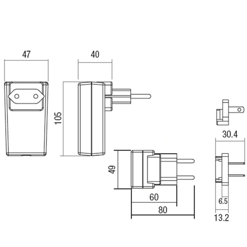 Spina LED dimmerabile a pulsante passante sul filo. Caratteristiche tecniche: alimentatore elettronico dimmerabile a pulsante con prese a spina intercambiabile per uso indipendente a tensione costante VDT 12 -24V. Corrente costante CDT (vedi tabella). Completo di adattatori per Eu e USA, accessorio a richiesta UK, CHINA, Australia