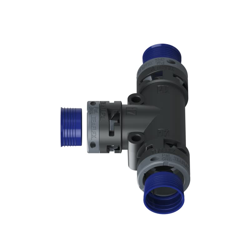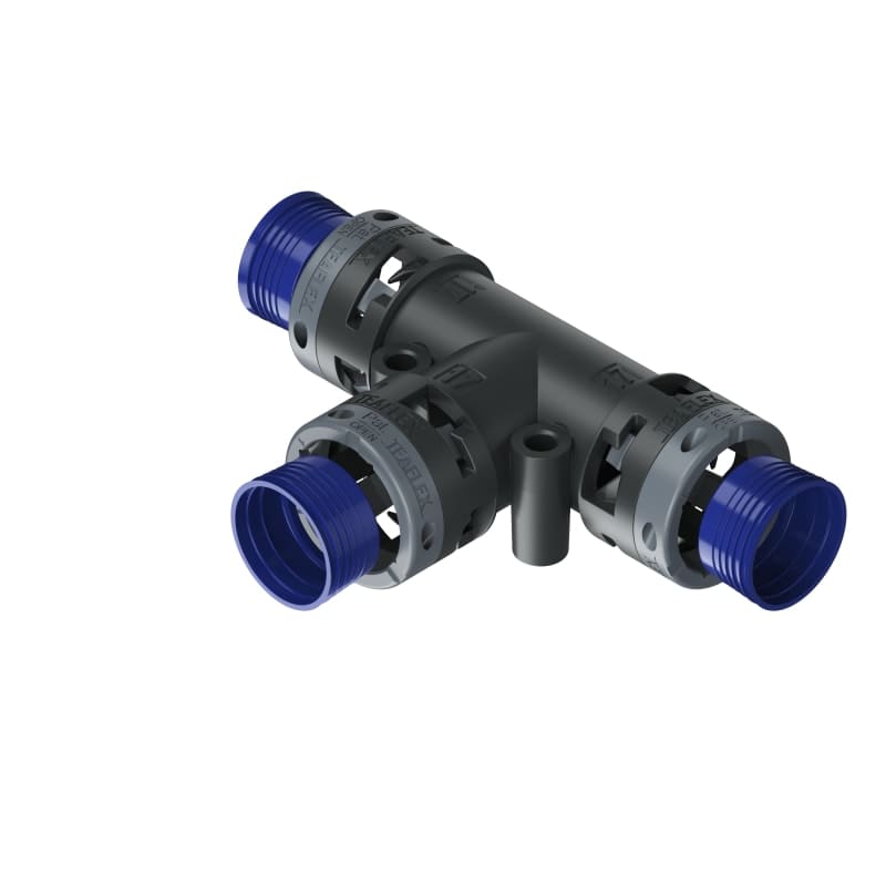Il raccordo di distribuzione è stato progettato con lo specifico intento di dividere fasci di cavi in linee di derivazioni multiple. La forma a T permette l'inserimento e l'uscita dei cavi da qualsiasi ingresso del raccordo consentendo collegamenti in linea e a 90°. Soddisfa i requisiti standard nelle installazioni elettriche industriali e nelle applicazioni tecniche ad elevate prestazioni nell'industria pesante e nel settore ferroviario IP68/IP69K.