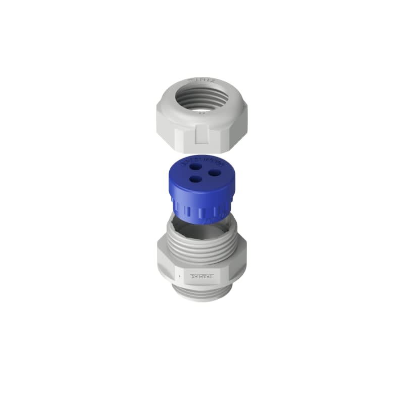 Pressacavo industriale multiforo in poliammide, questo pressacavo permette l’installazione di più cavi con ∅ esterno uguale consentendo un notevole risparmio di spazio. I fori dei gommini con la S finale non sono passanti IP68.