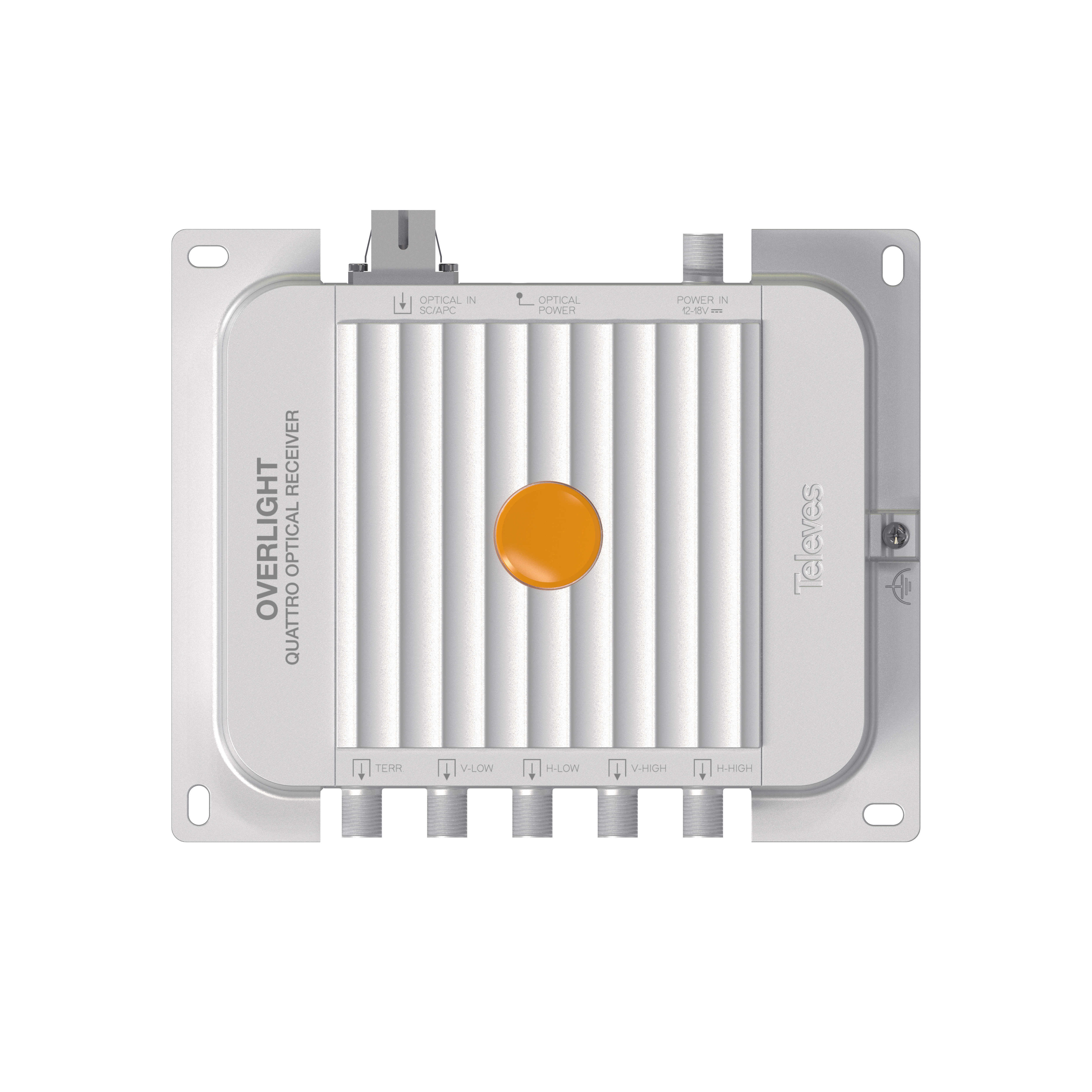 Ricevitore ottico Overlight Quattro (polarità separate) FM/DAB/UHF/SAT. Questo ricevitore ottico completo Wideband satellitare e terrestre cattura il segnale ottico TV su un'unica fibra (1200...1600nm) e ripristina i segnali TV terrestri e satellitari originali, fornendo 4 uscite RF con modalità Quattro: una delle quattro polarità e combinazioni di banda sono fornite su ciascun connettore. Grazie alla sua elettronica ottimizzata e alle basse perdite, consente di ridurre il numero di amplificatori necessari e semplifica l'implementazione nella progettazione di installazioni condominiali, preservando la qualità del segnale durante tutto il processo. Inoltre è perfettamente indicato per l'utilizzo in impianti GPON. Questo dispositivo fa parte del sistema Overlight, che distribuisce segnali satellitari e terrestri a più utenti attraverso un'unica fibra ottica. . Dimensioni molto leggeri e compatte. Compatibile con le distribuzioni GPON. Basse perdite. Elettronica ottimizzata. Design, qualità e produzione europei al 100%. Connettore ottico SC/APC. Connettori RF di tipo F. Telaio in Zamak ad alta schermatura. Montaggio a parete. Diverse opzioni di alimentazione: remotamente tramite il multiswitch (richiede alimentazione su tutti i connettori satellite) o tramite alimentatore.