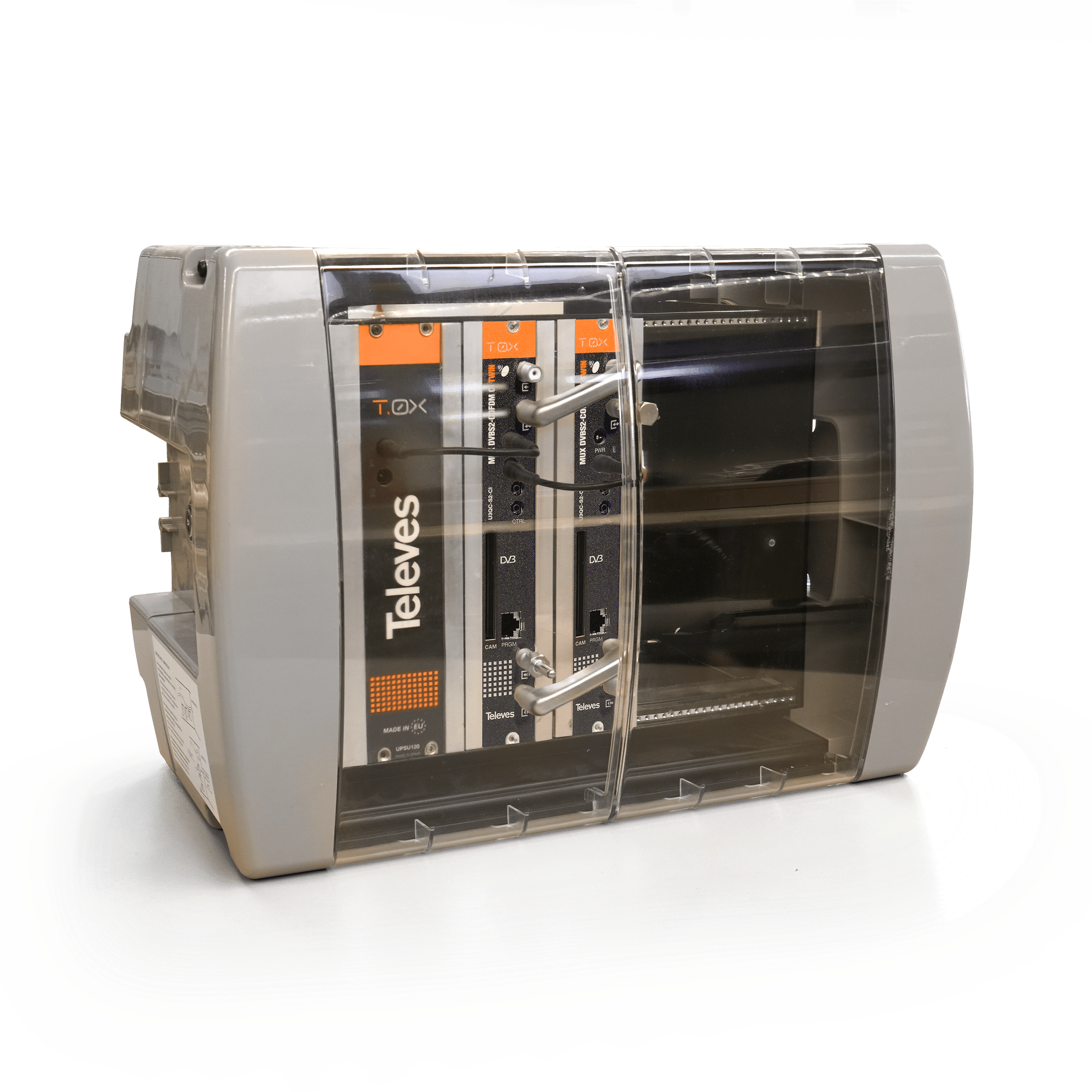 Kit TivùSat Small: Centrale di testa T.0X preconfigurata DVBS/S2 - COFDM, 16 programmi. Centrale di testa modulare ed espandibile, installata all’interno di un armadietto ventilato e dotato di serratura, con predisposizione per il montaggio a parete. Viene fornita già assemblata e programmata per ricevere i segnali dall' operatore TivúSat, con una configurazione di 16 programmi delle principali emittenti internazionali. Questo è possibile grazie a due moduli trasmodulatori (Art. 565401) che possono processare 8 transponder selezionabili da 4 diversi ingressi satellitari, in abbinamento alla PRO-Cam SD/HD (Art. 7161) e alla smart card multiutenza (Art. 716102) per la decriptazione dei programmi radio-televisivi. In uscita sono generati 4 MUX COFDM completamente indipendenti.
