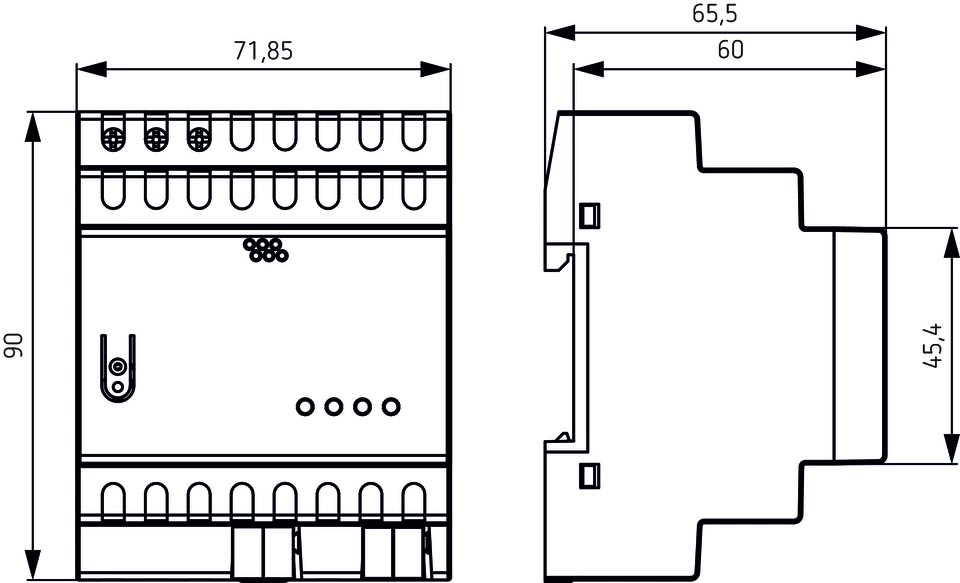 Alimentazione 1280 mA, 30 V DC di tensione ausiliaria, Alimentatori di tensione e controllo la tensione di sistema KNX, Tasto reset per 20 sec. reset bus, Resistente a cortocircuito permanente,