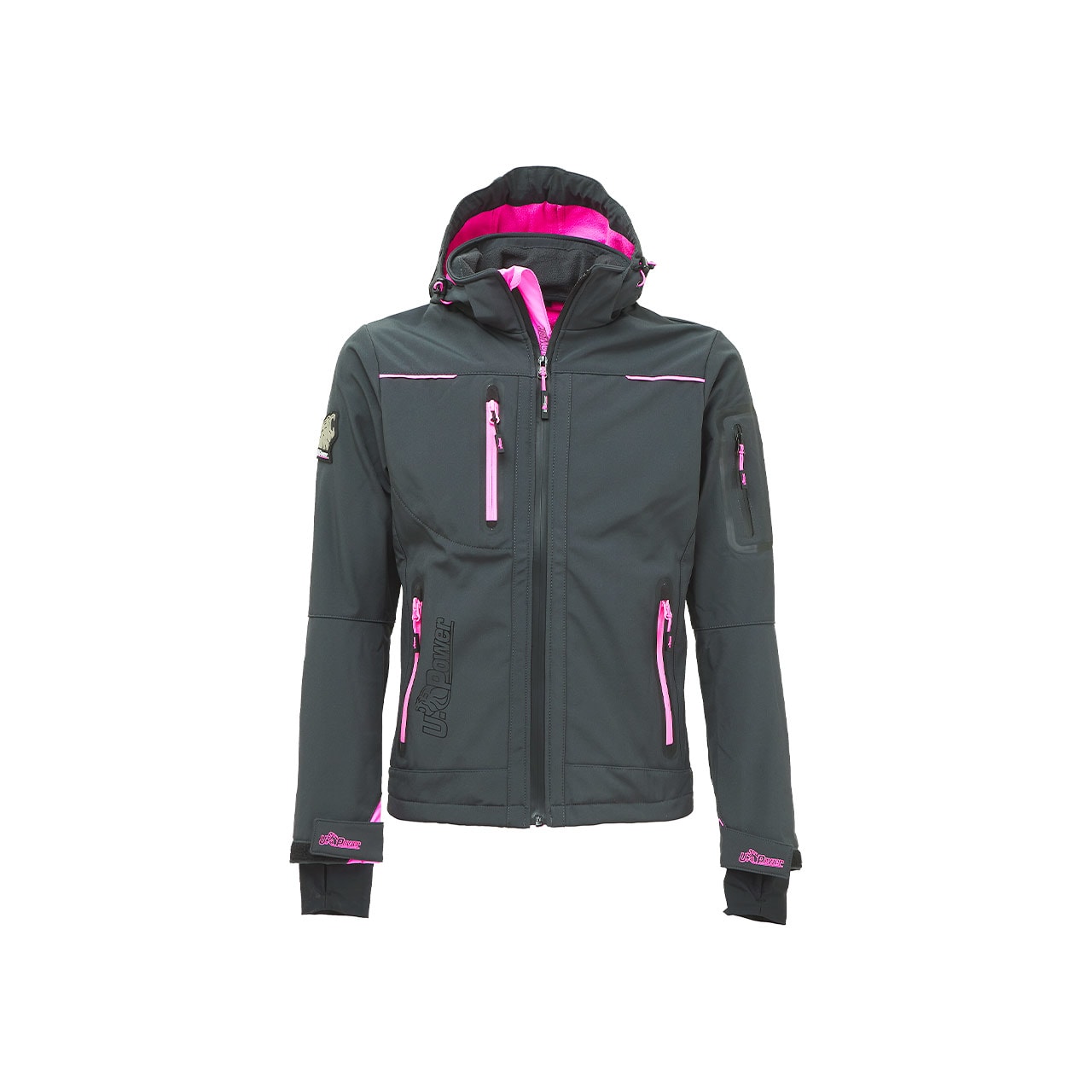Giacca in Softshell colore Grey Fucsia con membrana U-Tex che rende il tessuto impermeabile, traspirante e antivento. Giacca molto comoda e resistente con una fodera interna in morbido micro-fleece fluo. Chiusura centrale con zip impermeabile. Maniche preformate per vestibilità ottimale, cappuccio regolabile e staccabile, polsini regolabili con velcro e polsino antivento elasticizzato con foro passa-pollice. Dotato di due tasche frontali chiuse con zip fluo e coulisse antimpigliamento regolabile all’interno. Una tasca porta cellulare sul petto con tecnologia Free Sound chiusa con zip fluo. Due ampie tasche interne. Tasca supplementare termosaldata su manica sinistra. Fondo sagomato. Nastro reflex su colletto nella parte posteriore. Logo U-Power tono su tono. COMPOSIZIONE: 96% poliestere • 4% spandex • 320 gr/m² • Membrana U-TEX . NORMATIVA EUROPEA: EN 14058, EN ISO 13688:2013