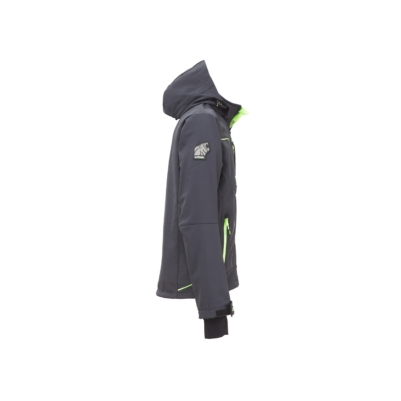 Giacca in Softshell colore Asphalt Grey Greencon membrana U-Tex che rende il tessuto impermeabile, traspirante e antivento. Giacca molto comoda e resistente con una fodera interna in morbido micro-fleece fluo. Chiusura centrale con zip impermeabile. Maniche preformate per vestibilità ottimale, cappuccio regolabile e staccabile, polsini regolabili con velcro e polsino antivento elasticizzato con foro passa-pollice. Dotato di due tasche frontali chiuse con zip fluo e coulisse antimpigliamento regolabile all’interno. Una tasca porta cellulare sul petto con tecnologia Free Sound chiusa con zip fluo. Due ampie tasche interne. Tasca supplementare termosaldata su manica sinistra. Fondo sagomato. Nastro reflex su colletto nella parte posteriore. Logo U-Power tono su tono. COMPOSIZIONE: 96% poliestere • 4% spandex • 320 gr/m2 • Membrana U-TEX. NORMATIVA EUROPEA: EN 14058, EN ISO 13688:2013