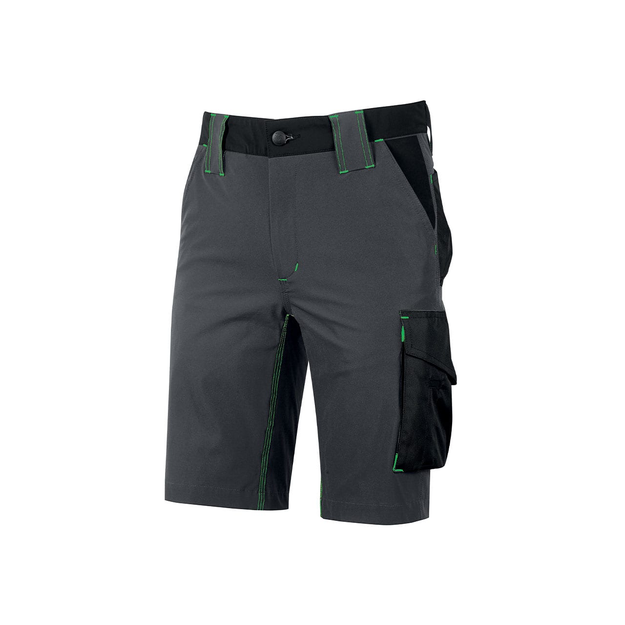 Bermuda, colore Asphalt Grey Green, in tessuto U-4 (U-Power 4 way stretch) molto comodo, resistente, morbido sulla pelle, idrorepellente, traspirante e asciuga rapidamente. Dotato di due ampie tasche anteriori, elastico in vita con un sistema innovativo di regolazione a scomparsa. Carrè posteriore accentuato per una maggior protezione della parte lombare e nastro reflex su passante tubolare posteriore. Tasca laterale porta utensili, multifunzionale con porta badge a scomparsa, due tasche posteriori di cui una con pattina e una con chiusura di sicurezza a velcro. Due tasche, chiuse con zip in corrispondenza del tascone laterale e della tasca frontale destra. Triple cuciture, bottone antigraffio, zip YKK, Slim Fit. COMPOSIZIONE: 86% NYLON – 14% SPANDEX – 140gr/m2. NORMATIVA EUROPEA: EN ISO 13688:2013