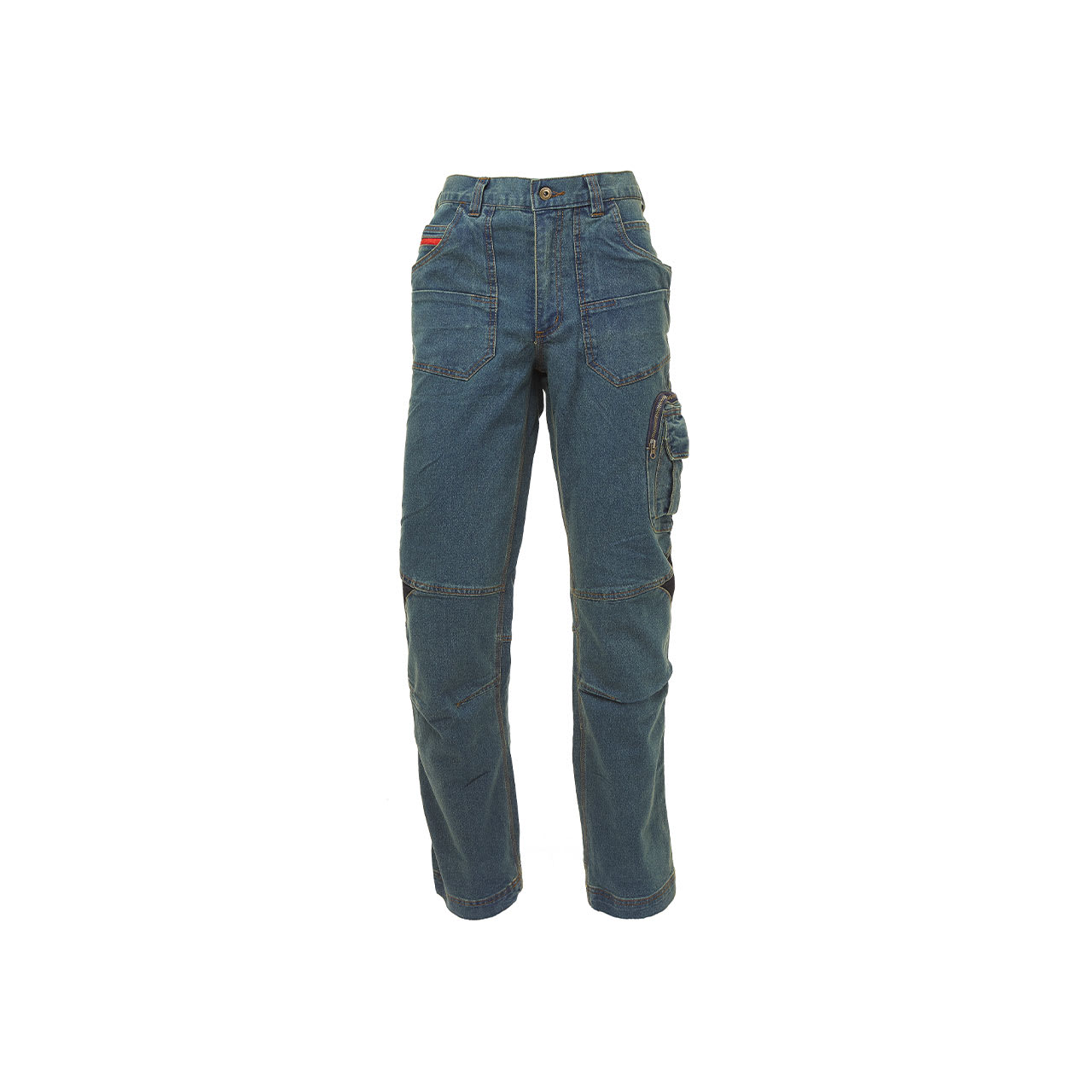 Pantalone in tessuto jeans stretch. 2 ampie tasche anteriori con soffietti tecnici stretch; tasca portamonete, tasca laterale portautensili, multitasca funzionale laterale con portacellulare, 2 tasche posteriori con sistema Free Pocket di cui una con chiusura di sicurezza con zip. Inserti tecnici stretch laterali e su snodo ginocchio; regolazione vita con velcri. Triple cuciture. COMPOSIZIONE: 70% cotone • 27% poliestere • 3% elastene • 330 gr/m² . NORMATIVA EUROPEA: CE EN ISO 13688:2013