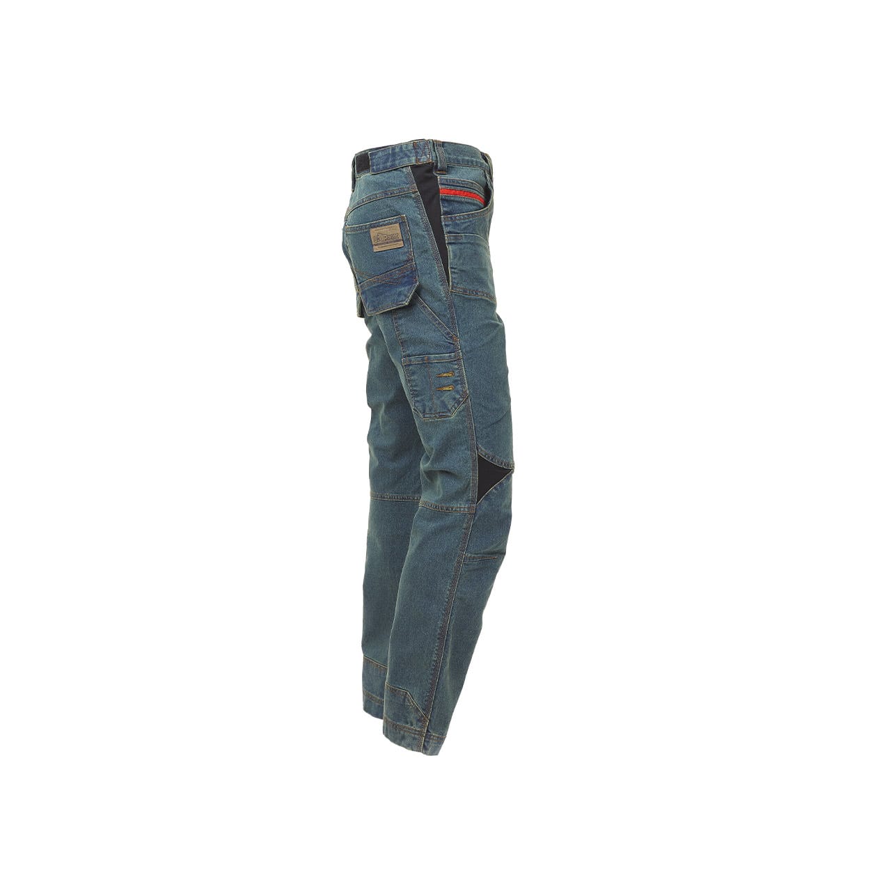 Pantalone in tessuto jeans stretch. 2 ampie tasche anteriori con soffietti tecnici stretch; tasca portamonete, tasca laterale portautensili, multitasca funzionale laterale con portacellulare, 2 tasche posteriori con sistema Free Pocket di cui una con chiusura di sicurezza con zip. Inserti tecnici stretch laterali e su snodo ginocchio; regolazione vita con velcri. Triple cuciture. COMPOSIZIONE: 70% cotone • 27% poliestere • 3% elastene • 330 gr/m² . NORMATIVA EUROPEA: CE EN ISO 13688:2013