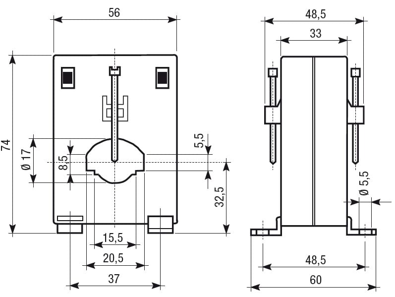 Trasformatore amperometrico a barra passante per strumenti in corrente alternata, fissaggio su guida DIN o a pannello (tramite supporti in dotazione). Doppio morsetto per secondario.