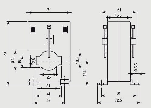Trasformatore amperometrico a barra passante per strumenti in corrente alternata, fissaggio su guida DIN o a pannello (tramite supporti in dotazione). Doppio morsetto per secondario.