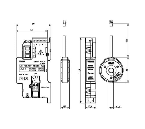Misuratore di energia, 3 ingressi per sensore di corrente toroidale, potenze rilevabili 25 W-100 kW, alimentazione monofase 120-230 V 50/60 Hz trifase 230/400 V 50/60 Hz, installazione su guida DIN (60715 TH35), occupa 1 modulo da 17,5 mm. Fornito con unsensore di corrente toroidale.