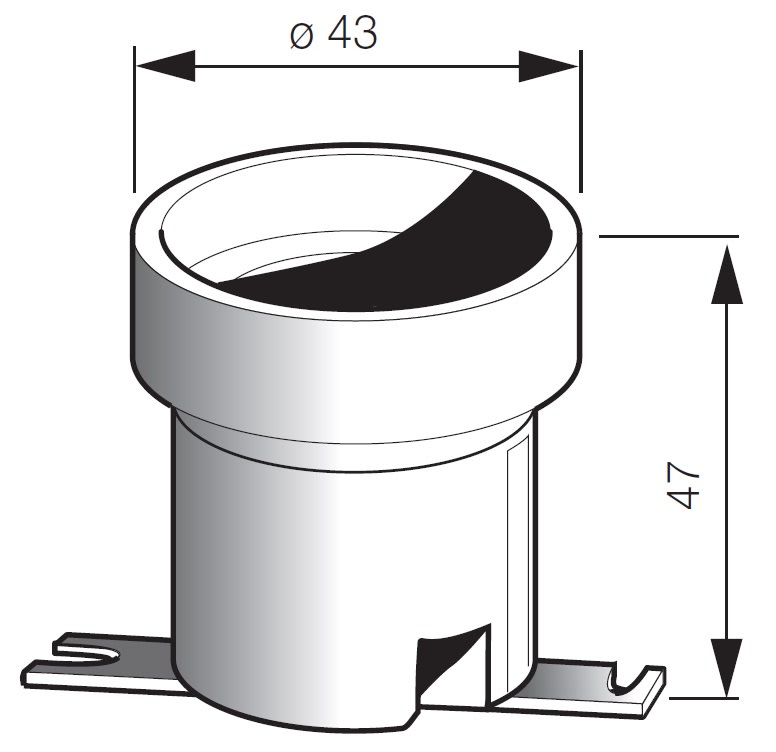 Portalampade E27, corpo porcellana cilindrico ø 43 mm, piastrina di fissaggio dritta, bianco. Asole di fissaggio ø 4,5x6 mm interasse 53 mm