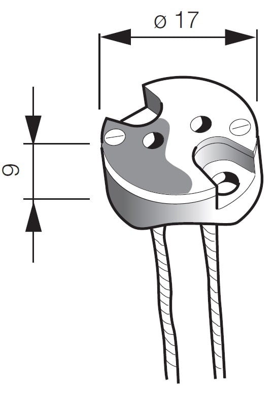 Portalampade 8 A 24 V per lampade alogene attacco G4 - G5,3 - GX5,3 - G6,35 - GY6,35 - 140 mm cavo teflon PTFE 0,75 mm2. Massima temperatura d’impiego continuo del portalampade 270 °C, del cavo 180 °C Fori di fissaggio ø 3,3 mm interasse 11,5 mm, corpo ø17 mm
