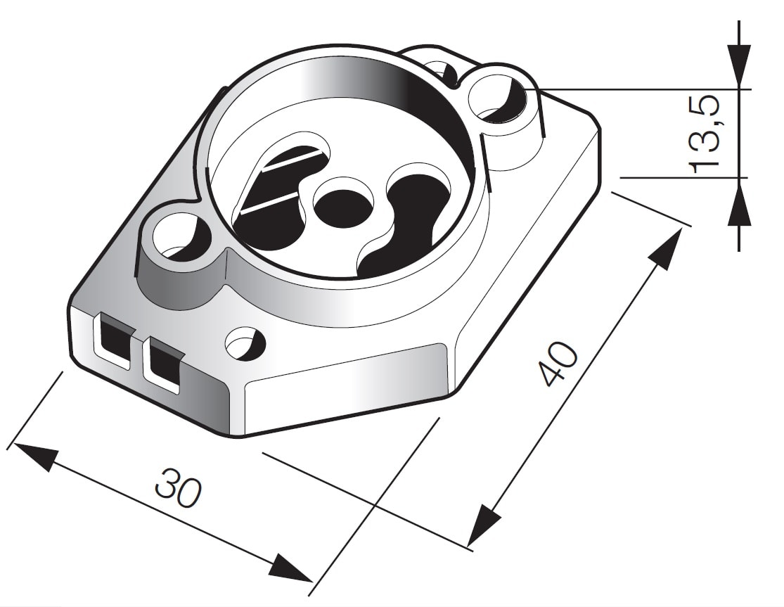 Portastarter 2 A 250 V, contatti ottone, massima temperatura d’impiego continuo 80 °C, bianco.Fori di fissaggio centrale ø 3,2 mm e sull’asse maggiore ø 3,2 mm interasse 31 mm