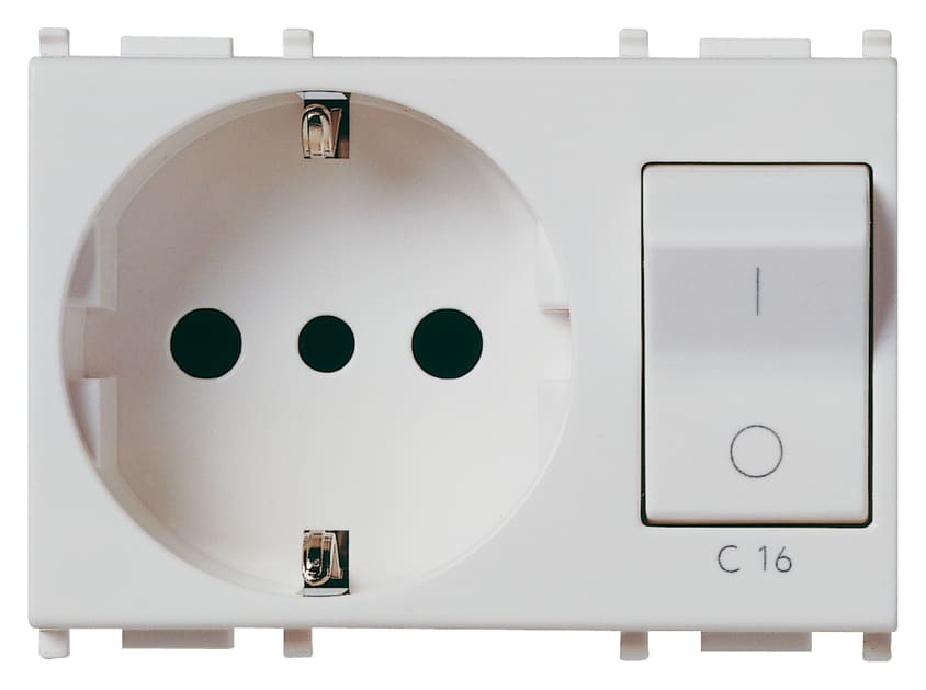 Presa SICURY 2P+T 16 A standard italiano tipo P30 (contatti di terra laterali e centrale), interbloccata con interruttore automatico magnetotermico 1P+N C 16, 230 V~ 50 Hz, p.i. 3000 A, Silver - 3 moduli