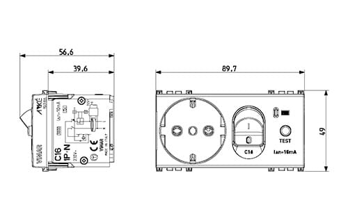 Presa SICURY 2P+T 16 A standard italiano tipo P30 (contatti di terra laterali e centrale), interbloccata con interruttore automatico magnetotermico differenziale 1P+N C 16, 230 V~ 50 Hz, I∆n 10 mA, p.i. 3000 A, grigio - 4 moduli