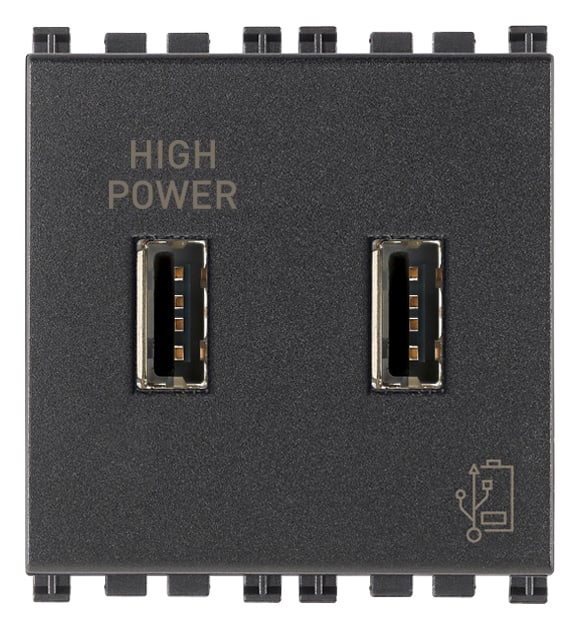 Unità di alimentazione 5 V 2,1 A per dispositivi elettronici, 2 uscite USB frontali, alimentazione 120-230 V~ 50/60 Hz - 2 moduli. Il dispositivo va utilizzato per ricaricare i telefoni cellulari e tutti gli apparecchi elettronici che offrono la possibilità di ricarica da una qualsiasi presa standard USB. Il dispositivo permette di ricaricare due apparecchi contemporaneamente.
