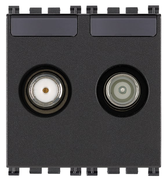 Presa coassiale TV-RD-SAT, 5-2400 MHz, diretta (derivata), demiscelata, 2 uscite con connettore maschio (TV-RD) e connettore tipo F femmina (SAT), attenuazione di derivazione 1 dB, grigio - 2 moduli. Permette il passaggio di corrente continua e segnali di controllo (24 V 500 mA max)