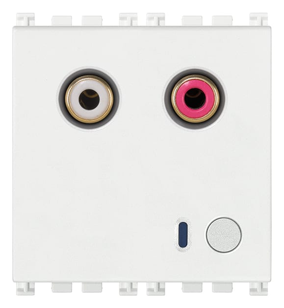 Ingresso audio con 2 connettori RCA, regolazione automatica del volume, terminatore di linea incorporato, grigio - 2 moduli Il dispositivo, attraverso i 2 connettori RCA , consente di acquisire, digitalizzare e inviare sul bus By-me una generica sorgenteaudio analogica (ad esempio impianto Hi-Fi, lettore CD, lettori MP3 portatili ecc.). Il bus By-me è disaccoppiato galvanicamente dagli ingressi audio. Bianco.